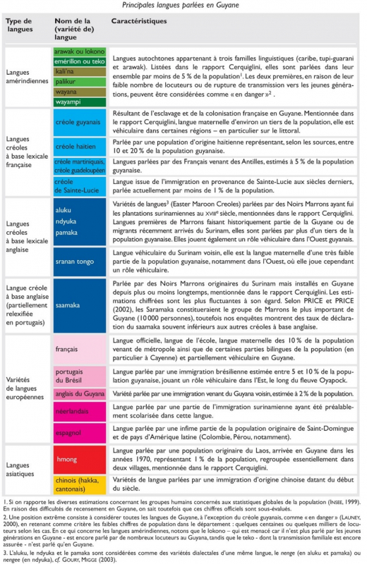 Il y a différentes manières de représenter la diversité linguistique à l’échelle d’un territoire comme celui de la Guyane. On peut notamment proposer une liste de langues, comme dans le tableau 1, insistant sur leurs caractéristiques linguistiques et sur la proportion estimée de locuteurs de cette langue. Dans ce tableau, une vingtaine de langues sont listées. Parmi elles, 12 se retrouvent sur la liste des langues de France établie en 2003 (Cerquiglini 2003), ce sont désormais les « langues de Guyane » pour lesquelles des dispositifs d’enseignement sont possibles (Goury et al 2000, Alby et Léglise 2005, 2016) même si c’est à titre expérimental (Lemercier, Muni Toke et Palomares, 2014).
