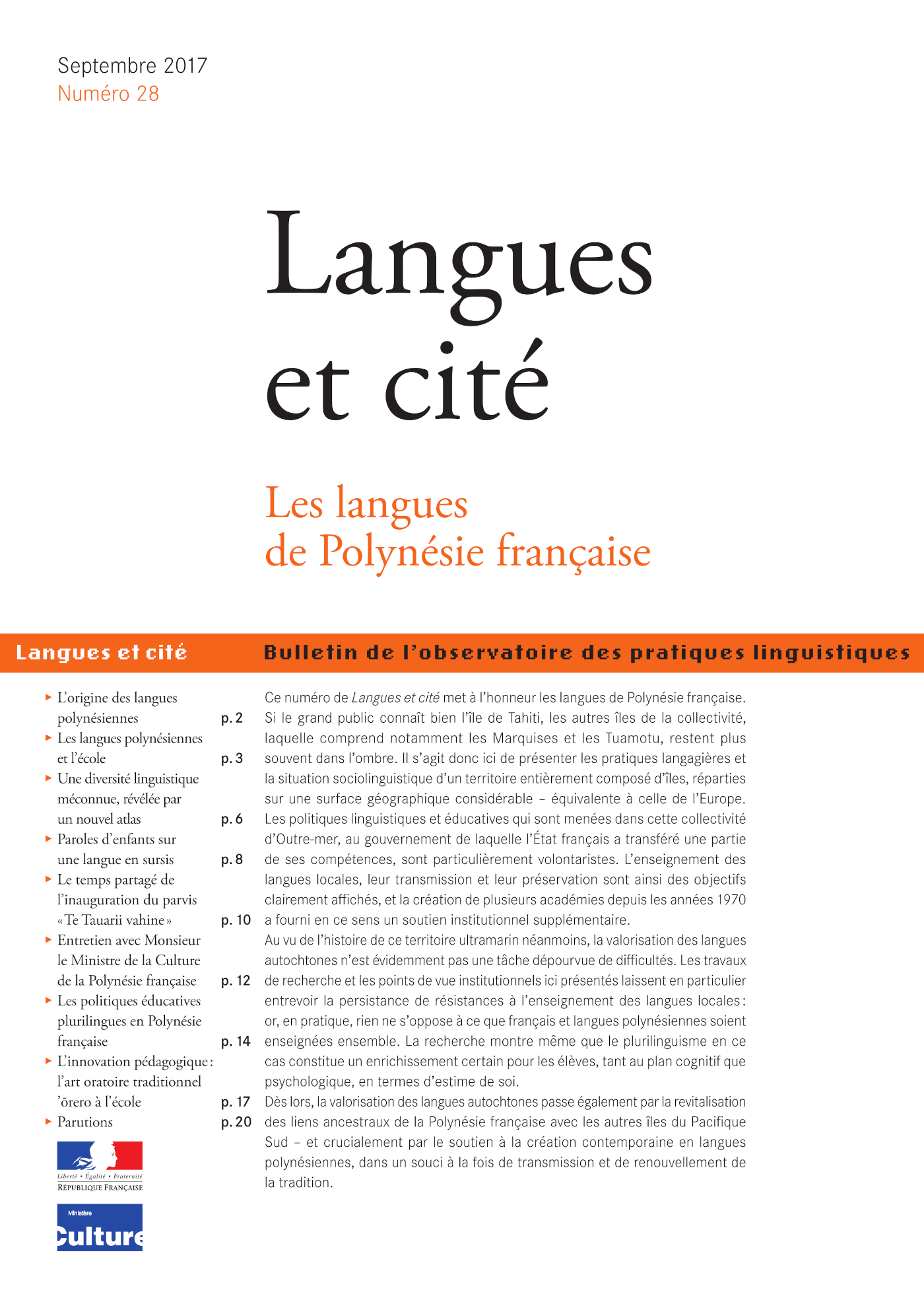 28 | 2017 : Les langues de Polynésie française Couverture. Les langues de Polynésie française. L&C n° 28. 2017 Fichier original 00_couv_l_c_28_2017_polynesie.jpg (image/jpeg – 739k)