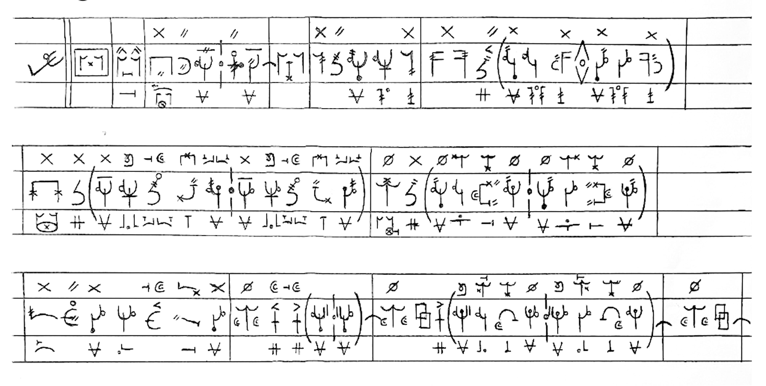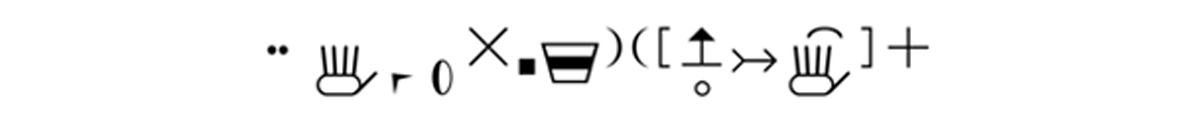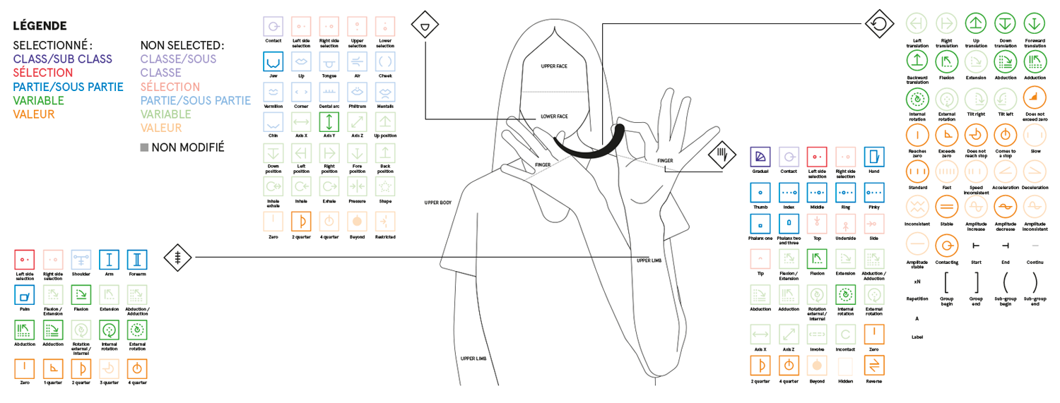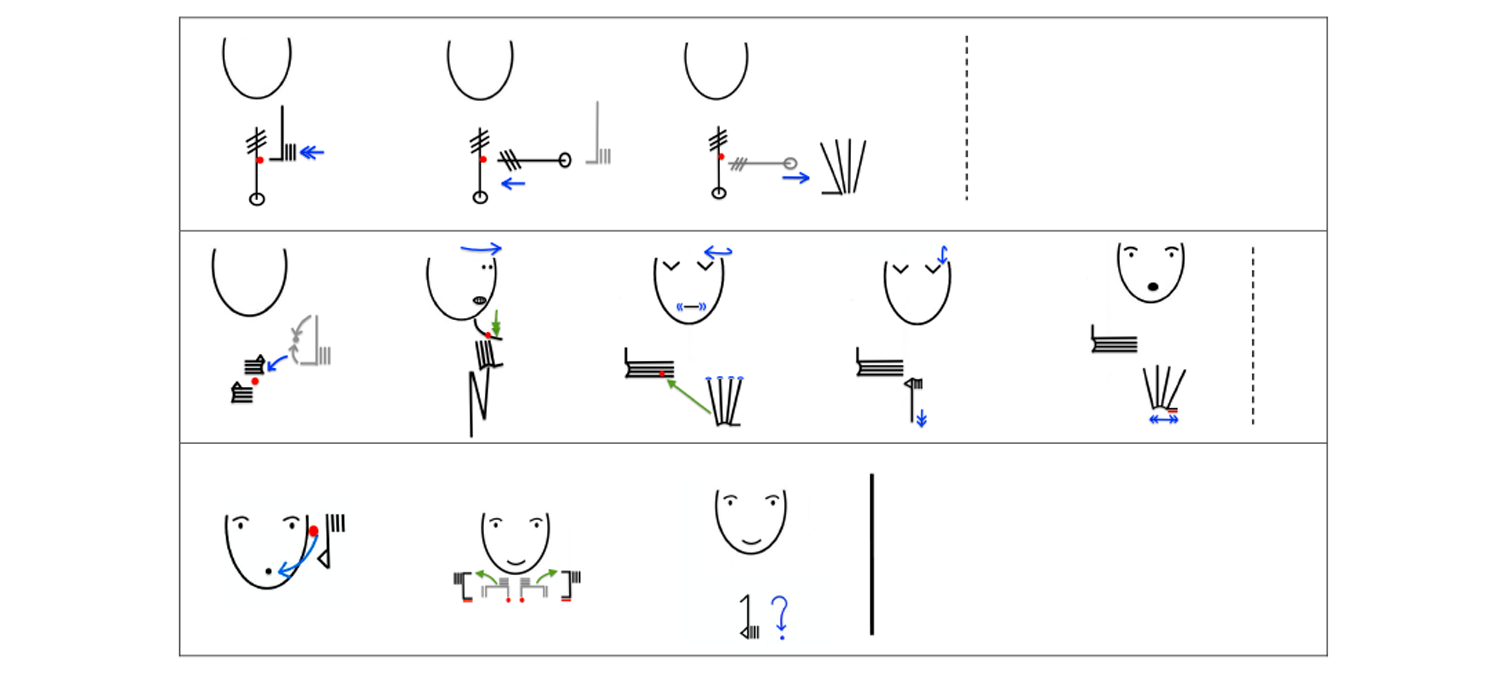 Les langues des signes sont, certes, les langues des locuteurs, mais elles sont aussi un objet d’étude des linguistes. Or, ces derniers ont besoin de développer des systèmes de transcription qui permettent de décrire de manière fine, fidèle, lisible et requêtable les données de langues des signes. Ce besoin est concomitant des débuts de la linguistique des LS : William Stokoe, fondateur du champ, avait lui-même développé une notation [ill. 9], qui visait à garder une trace des trois paramètres manuels (peu après devenus quatre) selon lesquels s’analysaient, pour lui, les signes des dictionnaires. La plupart des systèmes inventés depuis, comme HamNoSys [ill. 10], sont une variante affinée du système de Stokoe : ils restent centrés sur la représentation des paramètres manuels. En France cependant, depuis dix ans, l’équipe GestualScript de l’ESAD d’Amiens, en collaboration avec les laboratoires FoReLLIS (Université de Poitiers) et DyLIS (Université de Rouen-Normandie), travaille au développement de Typannot [ill. 11] (Boutet, 2018 ; Danet et al., 2021), un système de transcription phonologique de la LS et de la gestualité co-verbale qui vise une description cohérente et requêtable de l’ensemble du corps tout en garantissant la lisibilité humaine des données.