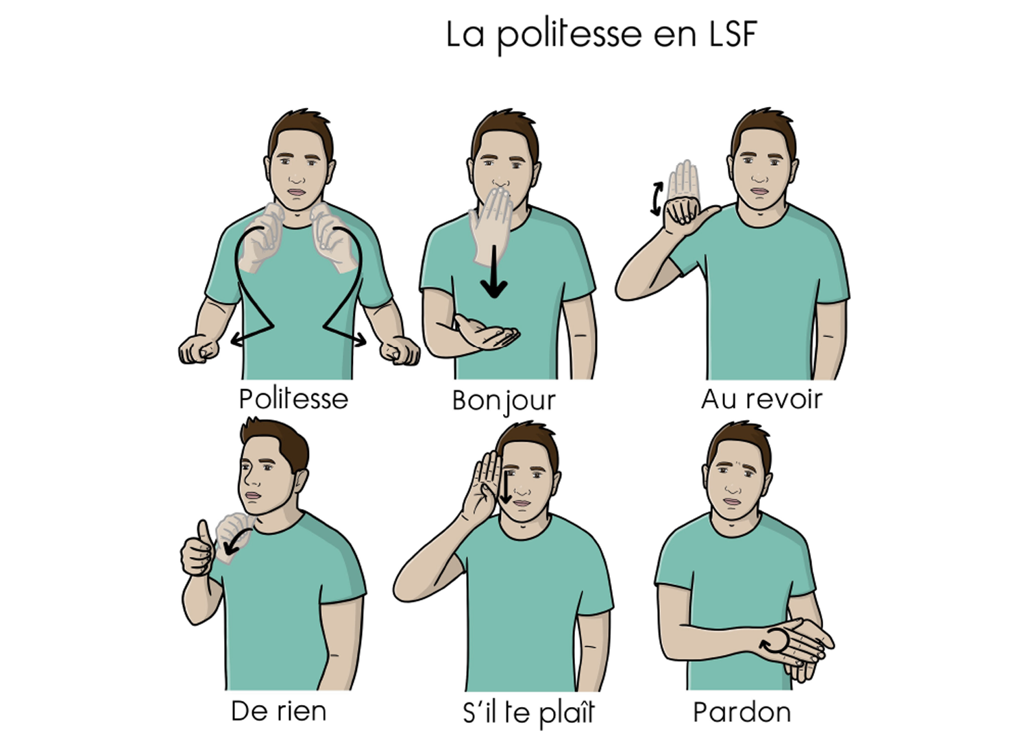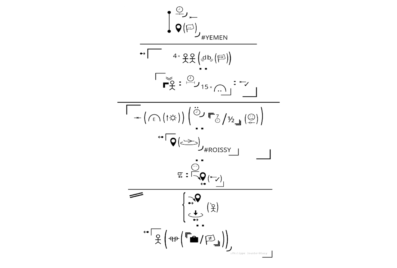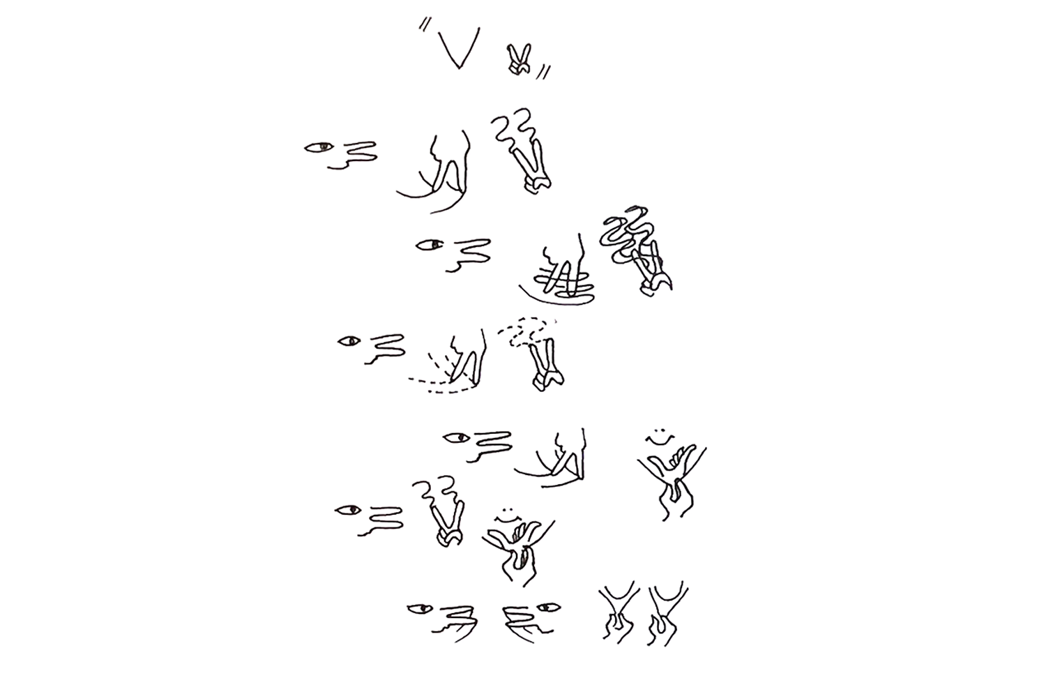 Toutefois, les signes sont dessinés dans des dictionnaires de LSF, des livres pour enfants [ill. 1], des manuels de LS [ill. 2], etc. Associés à des flèches, à une disposition adéquate dans l’espace graphique, parfois à des mots de français, ces dessins permettent aux sourds de produire d’authentiques textes qui se rapprochent de l’organisation visuelle des LS. Ces productions, souvent très personnelles, peuvent servir d’aide-mémoire, mais aussi à transmettre la culture sourde (cf. la fameuse partition de “Les pierres” de Victor Abbou [ill. 3] ou l’haïku « V » de Levent Beskardes [ill. 4]) ou encore à véhiculer des informations à un public sourd (cf. les schémas produits par Laurent Verlaine [ill. 5] et étudiés par Pierre Guitteny (2008) ou encore les illustrations utilisées dans le service fax du 114, le numéro d’urgence pour les sourds). Ces représentations des LS sont aussi utilisées par les professeurs dans les écoles bilingues, ou par les interprètes de LS lorsqu’ils se préparent, ou bien encore lors des formations en LS ou de LS, comme celle proposée aux agents du 114 à l’Université de Grenoble. L’ensemble de ces solutions graphiques servant à véhiculer des concepts en LS est l’une des origines du système AZVD [ill. 6], développé au laboratoire LISN de l’Université Paris-Saclay (Filhol, 2021).